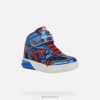 Paprasti kvėpuojantys vidutinio kirpimo sportbačiai jaunesniajam, sukurti geox ir marvel partnerystės dėka. Žmogaus voro kūrinys viršutinėje dalyje yra raudonos ir karališkos mėlynos spalvos, būdingos garsiajai kultinei figūrai. Pagaminta iš audinio ir atspausdintos odos efekto medžiagos, jo permatomame pade yra mirksinčios lemputės, o vaikai galės smagiai vaikščioti su savo garsiuoju superherojumi.