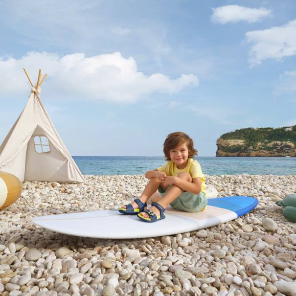 vandeniui atsparus atviras jaunųjų sandalas, skirtas nuotykių kupinoms išvykoms po atviru dangumi. ši gyva tamsiai mėlynos ir žalios spalvos fusbetto versija yra lengvo, kvėpuojančio dizaino, užsegama sagtimi ant piršto ir kulkšnies dirželiu. Pagaminta iš greitai džiūstančios odinės medžiagos, jis yra ant sukibusio pado, kuris bus veiksmingas ir slidžioje vietoje.