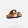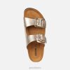 Kvėpuojantis, lengvas ir patogus sandalas moterims, pasižymintis šiuolaikišku žavesiu ir atpalaiduojančiu patrauklumu. ši neįprasta šviesiai auksinė versija turi dvigubą viršų, pagamintą iš metalinio odos efekto medžiagos. Brionia buvo sukurta stilingiems miesto miestiečiams ir akimirksniu paryškins kasdienę šilto oro aprangą.