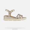 lengvi, kvėpuojantys sandalai moterims, įtaisyti ant žemo pleišto, kupini kasdieniško patrauklumo ir aktyvios energijos. Pagaminta iš šviesiai auksinės metalinės odos, ši rafinuota versija buvo su praktišku kulkšnies dirželiu ir dvelkia stilingumu. jis buvo sukurtas atsižvelgiant į miesto gyvenimo būdą ir suteikia moteriškumo ir komforto, todėl tai puikus būdas paaukštinti kasdienę aprangą karštais vasaros mėnesiais.