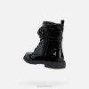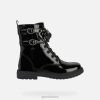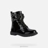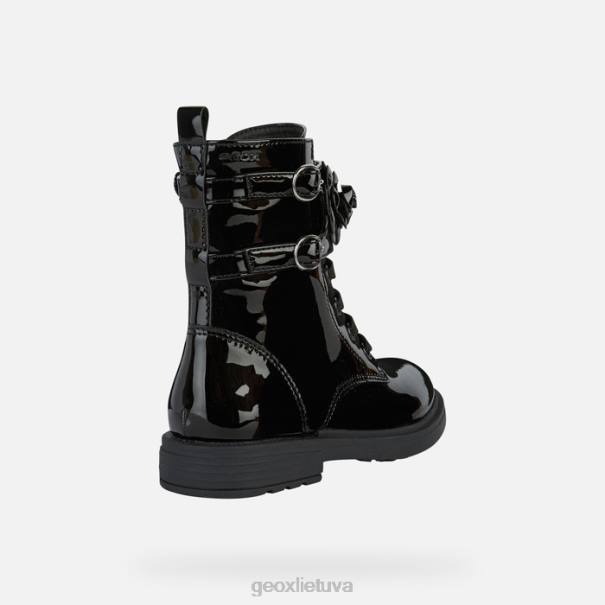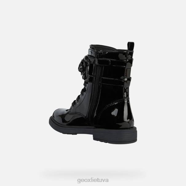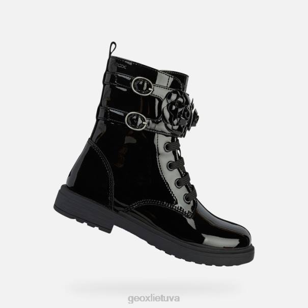 patogūs kvėpuojantys batai mergaitei su miesto prašmatnia estetika. Šiuolaikinis klasikinių karinių kovinių batų variantas, ekleras buvo pagamintas iš juodos lakinės odos efekto medžiagos ir papuoštas žavingais akcentais, pavyzdžiui, iškilusiomis gėlėmis ant užsegimo. tai geriausias būdas užbaigti miesto stilių su moterišku klestėjimu.